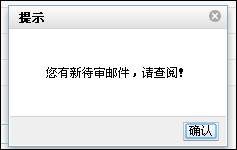 同時(shí)當(dāng)有新待審批郵件到達(dá)時(shí),系統(tǒng)自動(dòng)彈出提醒信息,通知審核人審核郵件。