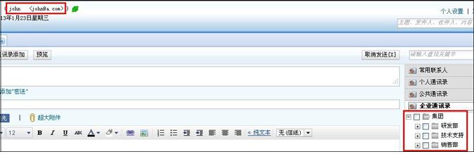 管理員授權(quán)后,被授權(quán)的郵箱用戶(如圖,用戶john)即可獲得查看地址簿權(quán)限,對(duì)權(quán)限內(nèi)用戶進(jìn)行郵件群發(fā)等操作。