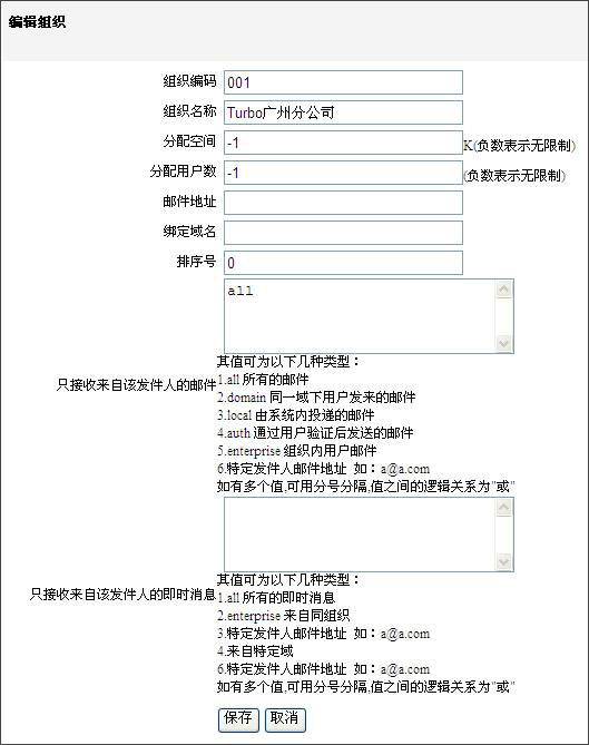 組織在TurboMail中可表示一個(gè)公司(組織),或一個(gè)分公司(單位),用戶可以根據(jù)自己的需要來(lái)設(shè)置這個(gè)單元的具體意義,組織編碼必須唯一。