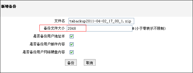 解決方法:通過修改TurboMail程序,將備份改成可以設定備份的文件大小,比如設置單個備份文件2GB,當備份超過2GB,自動生成下一個備份文件,直到執(zhí)行備份為止。如截圖所示: