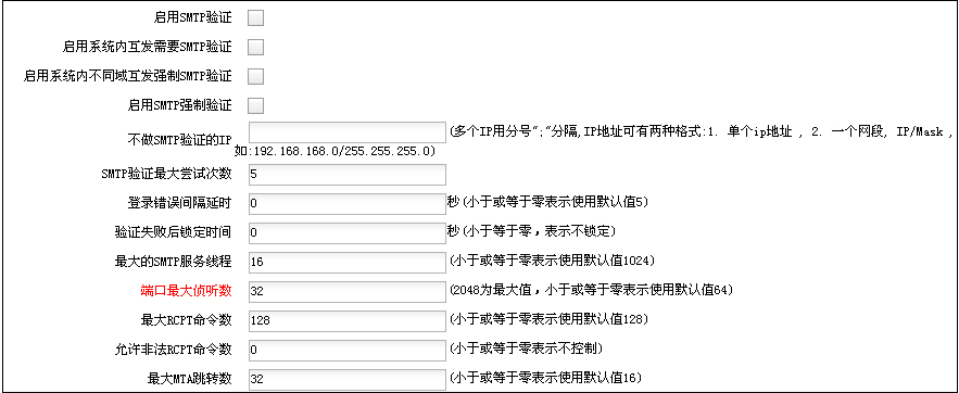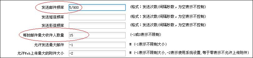 能夠?qū)κ招湃藗(gè)數(shù)、最大發(fā)送郵件容量、每次連接可以發(fā)送的郵件數(shù)量、同一個(gè)發(fā)信人每15分鐘可以發(fā)送的郵件數(shù)量、同一個(gè)發(fā)信人每天可以發(fā)送的郵件數(shù)量、同一個(gè)IP的同時(shí)連接數(shù)等參數(shù)進(jìn)行限制,保證系統(tǒng)安全。