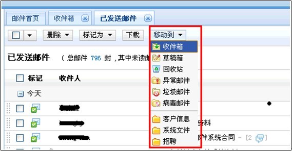 打開某個(gè)文件夾,可以標(biāo)記某封郵件或者批量標(biāo)記郵件,點(diǎn)擊頁(yè)面上方的“移動(dòng)到”按鈕,會(huì)出現(xiàn)多個(gè)選擇,用戶可選擇將已經(jīng)標(biāo)記好的郵件移動(dòng)到其他文件夾。