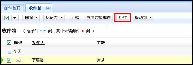 2)批量拒收郵件:在某文件夾的郵件列表頁(yè)面,選中要拒收的郵件,點(diǎn)擊頁(yè)面上的“拒收”按鈕,同樣會(huì)將這類郵件的發(fā)件人地址加入黑名單,以后凡是來自此類地址的郵件將不能發(fā)送到你的收件箱中。