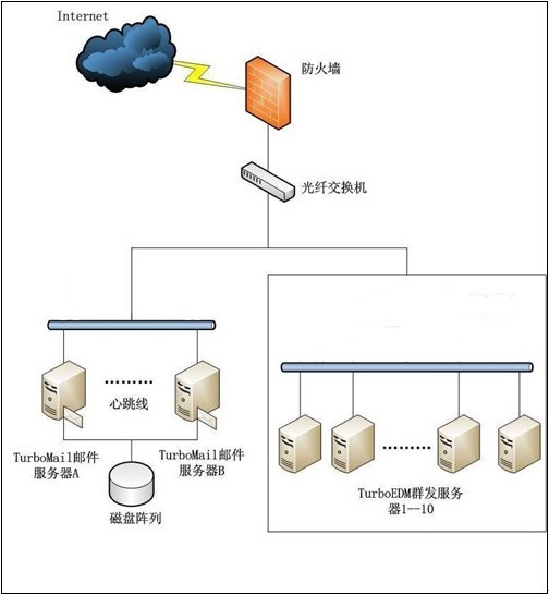 用戶收發(fā)郵件通過(guò)TurboMail郵件服務(wù)器進(jìn)行,建議采用雙機(jī)的部署模式,已保證郵件服務(wù)的7*24小時(shí)不間斷的運(yùn)行。郵件數(shù)據(jù)采用共享存儲(chǔ)模式,郵件數(shù)據(jù)存儲(chǔ)到磁盤陣列上。