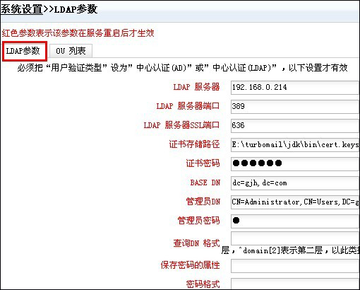 進入郵件系統(tǒng)管理界面,系統(tǒng)設(shè)置?D?D》LDAP參數(shù),如圖: