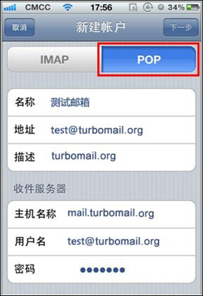 4. 稍等一會后,手機屏幕的帳戶信息下面會出現(xiàn)“收件服務器”、“發(fā)件服務器”的設置信息,選擇POP標簽: