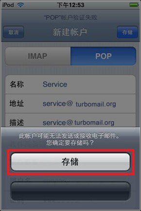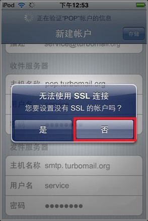 5. 填寫后點擊“存儲”,稍后手機屏幕會跳出SSL連接的對話框,點擊“否”: