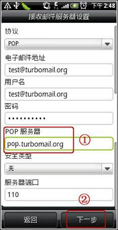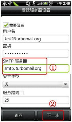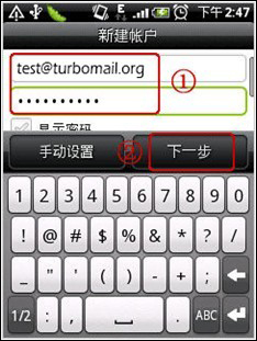 輸入您的完整的郵箱用戶名(test@turbomail.org )和郵箱密碼,點(diǎn)擊“下一步”: