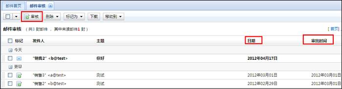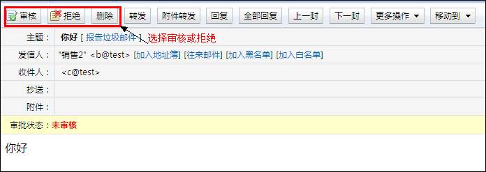 4. 審核人點擊待審核郵件列表查看郵件的內(nèi)容,點擊“審批”或“拒絕”等命令管理郵件。
