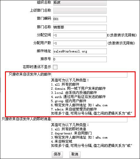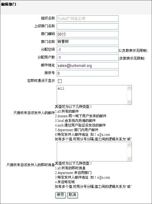 - 部門郵件地址:圖中舉例為"sales@turbomail.org"。如果發(fā)郵件到這個(gè)地址,該部門下面的所有人員(包括子部門人員),都可以收到該郵件。