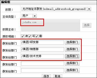 管理員授權(quán)后,被授權(quán)的郵箱用戶(如圖,用戶john)即可獲得查看地址簿權(quán)限,對(duì)權(quán)限內(nèi)用戶進(jìn)行郵件群發(fā)等操作。