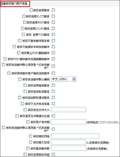 1.管理員進(jìn)入每個(gè)部門或者組織,可以批量設(shè)置對(duì)所有部門成員的郵箱設(shè)置,如下: