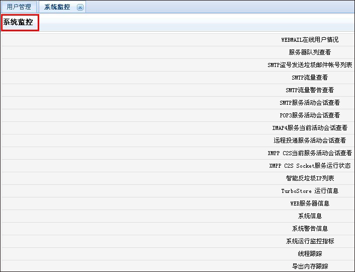 TurboMail的系統(tǒng)監(jiān)控功能是純Web圖形化監(jiān)控模式,包含以下內(nèi)容: