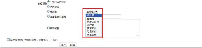 注意:可以選不執(zhí)行以后規(guī)則、拒絕接收、發(fā)送到如圖紅色框框的文件夾、轉發(fā)到其他郵箱、自動回復,但是以上條件只能執(zhí)行其中的一條。