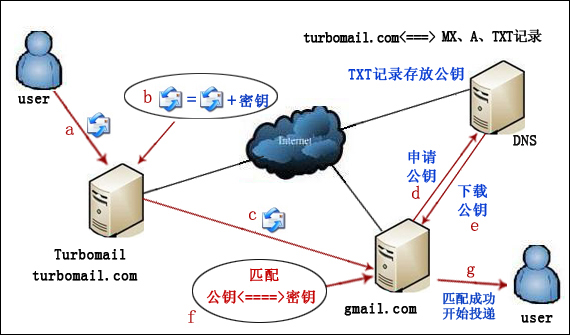 TurboMail郵件系統(tǒng)支持DKIM功能,客戶配置使用該功能后,發(fā)送郵件時在每封電子郵件上增加加密的數(shù)字標(biāo)志,以支持接收方與合法的互聯(lián)網(wǎng)地址數(shù)據(jù)庫中的記錄進行比較。由于GMAIL、YAHOO、SINA、QQ等大型郵箱系統(tǒng)會對收件進行DKIM驗證,因此配置此功能后,能大大提高客戶們發(fā)郵件至這些大型郵箱系統(tǒng)的成功率。