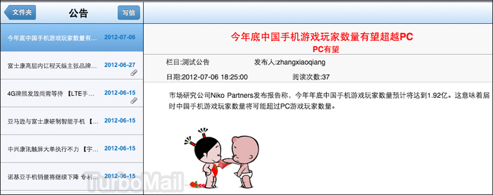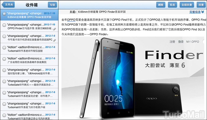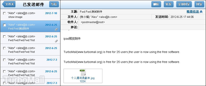 TurboMail郵件系統(tǒng)為了迎合廣大郵箱用戶的需求,開(kāi)發(fā)網(wǎng)頁(yè)郵箱iPad專屬界面,使用全新的UI和適用于iPad的交互方式,收發(fā)郵件有更佳的操作體驗(yàn),并提供圖片和附件的在線預(yù)覽功能,除了Office文檔,還支持Zip和Rar。除此之外郵箱界面采用Dojo編程開(kāi)發(fā),讓人賞心悅目,所有操作在觸摸中都能完美實(shí)現(xiàn)。
