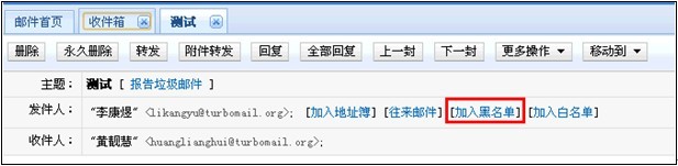 1)拒收某封郵件:在讀信頁(yè)面,選擇“加入黑名單”。